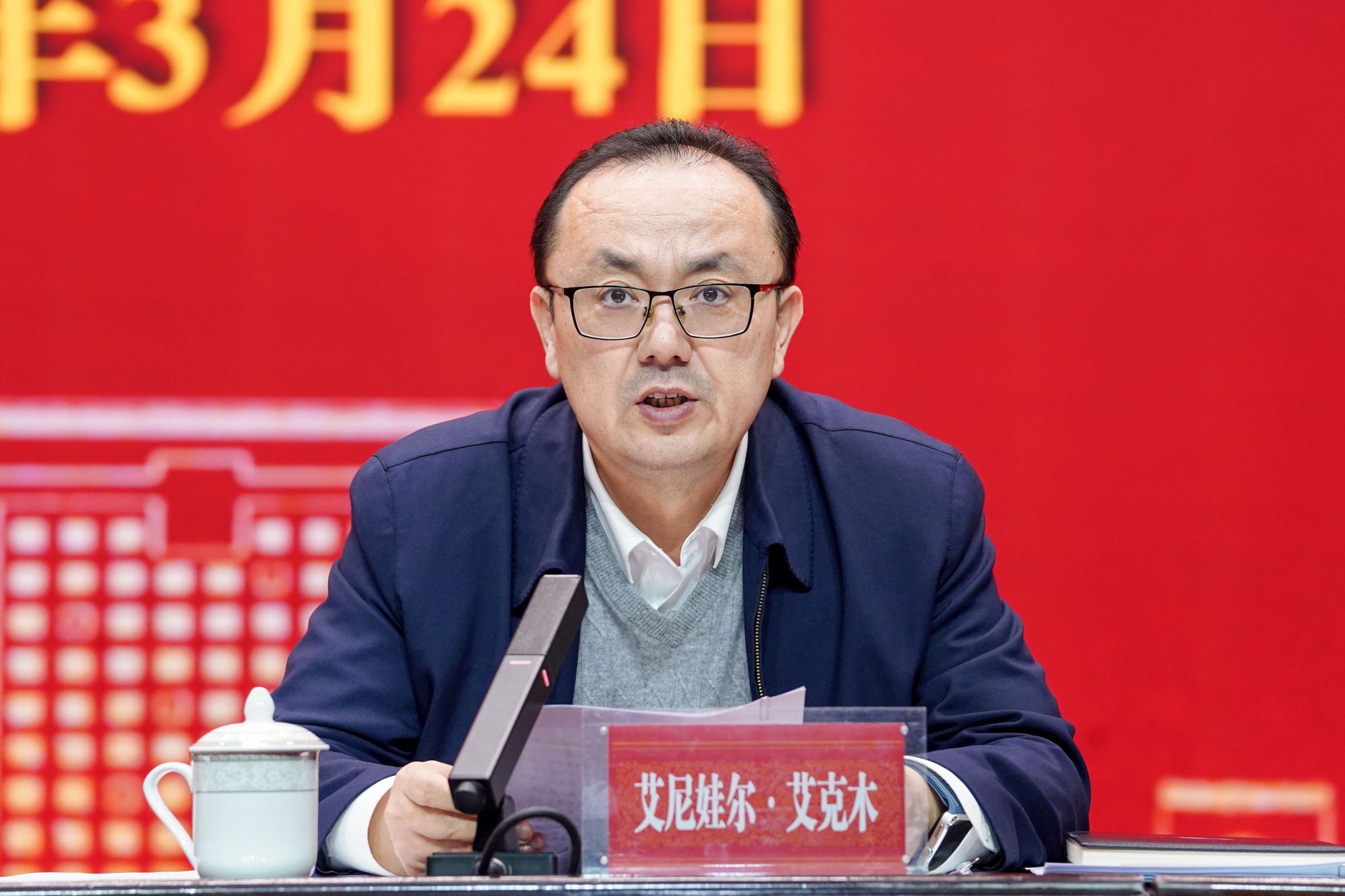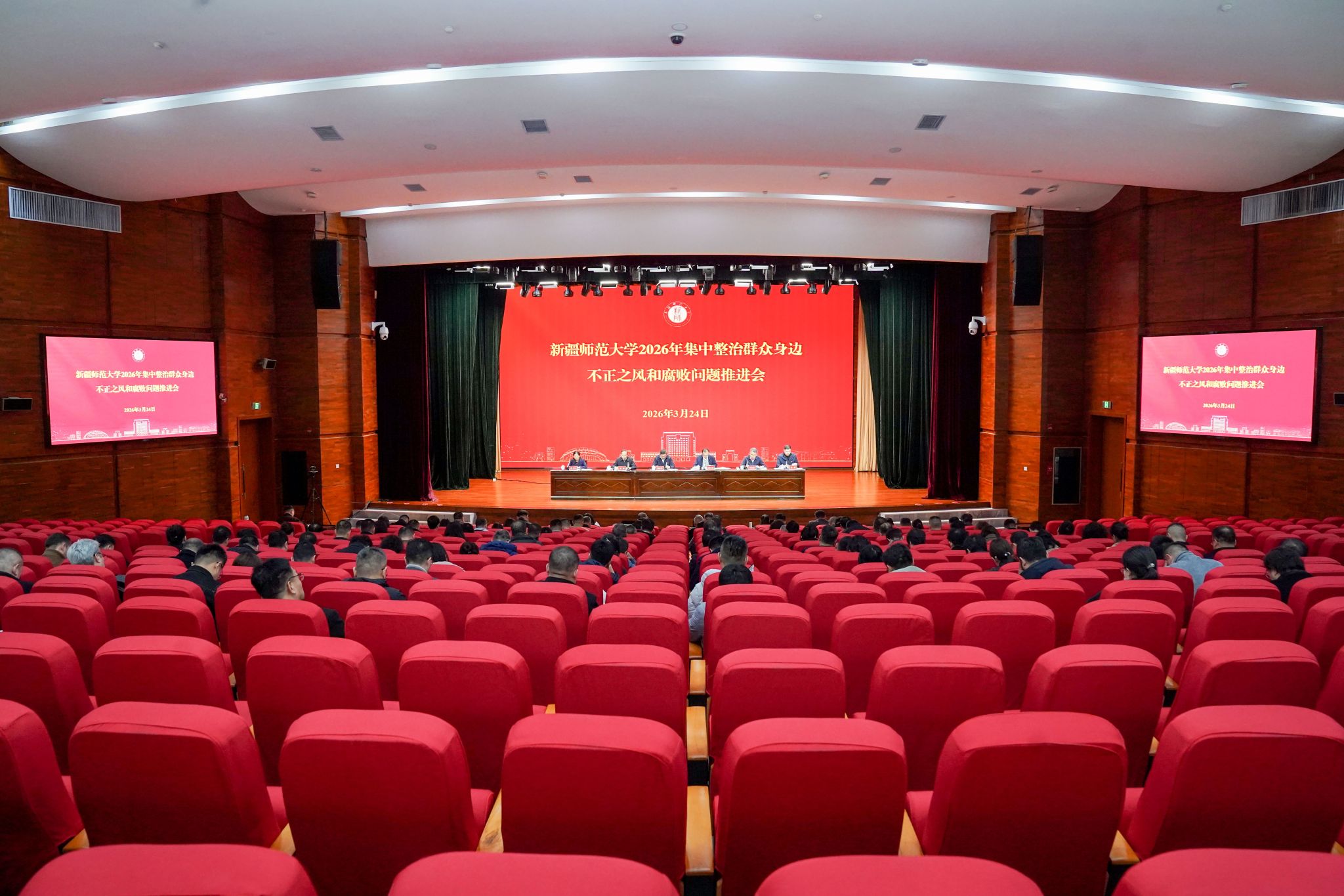 3月24日,新疆师范大学2026年集中整治群众身边不正之风和腐败问题推进会在温泉校区昆仑讲堂召开。校党委书记蒋海军参加会议并讲话,校党委副书记、校长艾尼娃尔·艾克木主持会议。